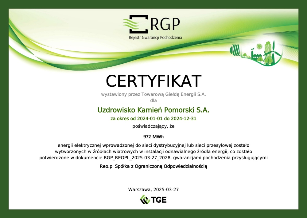 Dlatego z przyjemnością informujemy, że wraz z pozostałymi uzdrowiskami, należącymi do Grupy Uzdrowiska Polskie: „Uzdrowisko Iwonicz” SA, „Uzdrowisko Konstancin-Zdrój” SA oraz Zakład Leczniczy „Uzdrowisko Nałęczów” SA, korzystamy z energii elektrycznej pochodzącej w 100% z odnawialnych źródeł energii.